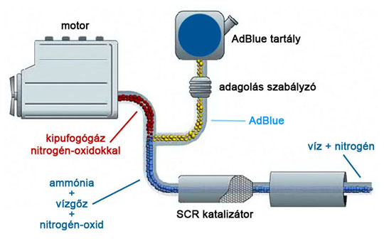A magas hőmérsékleten a karbamidból ammónia képződik. A második lépcsőben a kipufogógázban lévő nitrogén-oxidok az SCR katalizátor felületén az ammóniával lépnek reakcióba. Ennek során vízzé, és a természetben is nagy tömegben előforduló ártalmatlan nitrogén gázzá alakulnak át. Az SCR technológia előnye, hogy egyaránt alkalmas az Euro 4 és az Euro 5 normák nitrogén-oxid kibocsátásra vonatkozó követelményeinek kielégítésére. Az Euro 4 előírás teljesítéséhez az üzemanyag 3-5 százalékát, míg Euro 5 esetén - növelt katalizátor hatásfok mellett - mintegy 5-7 százalék adalékot porlasztanak a katalizátorra vezetett kipufogógázhoz, a motor üzemállapotától függően.